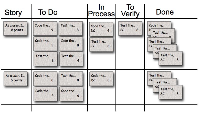 Each row on the task board is a product backlog item (in this particular example stories). During the sprint planning meeting the team selects the product backlog items they can complete