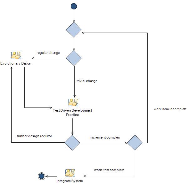 This diagram describes an evolutionary approach to developing software by incrementally considering a small part of the system. A brief amount of time is spent considering the possible design, the code is implemented using a test-first approach, and the design is reviewed and refactored until high quality software is achieved. The new part of the system is then integrated with the rest of the system, and another small part of the system is selected for development.