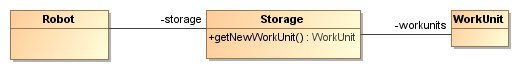 agents run in different execution environments and interaction is message-based. Internally, a statement such as storage.getNewWorkUnit() dereferences the association to storage and calls the getNewWorkUnit(), returning a reference to an object of type WorkUnit. In a message-based system